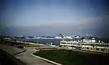 The Spit in the Soviet period. A dark gray building in the center is the former Alexander Nevsky Cathedral, converted into a warehouse. 1985.