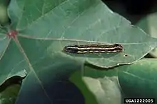 The armyworm has six instars as they grow to attain a length of about 35 mm. Larvae are green or blackish green with uniform light brown or reddish brown through the period of development. Each side has a broad yellowish stripe that has a dark spot on the first abdominal segment. Series of dark triangles are usually present dorso-laterally along the length of the body. Larvae are usually found on the lower part of leaves and are more active at night than during the day. The larval stage usually lasts around 14 to 20 days.