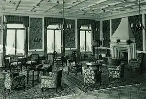To the left of the vestibule, the front half of the new northern wing was, on the ground floor, entirely occupied by a large hall-lounge. At one end of this area, beside the vestibule and separated from the rest of the hall by glass doors and a glass partition, was the hotel library, comprising more than 300 volumes, kept in a large wall mounted glass fronted bookcase. At the heart of the room, on its eastern side, was the fireplace. Elsewhere clusters of arm chairs and sofas were grouped around low tables. The walls were coated in fabric and the hall featured parquet flooring. The adjacent games room, allocated in the architect's drawing to "ping-pong", has at different times been used as a billiards room and as a bridge (card game) room.