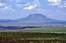 Square Butte also forms a unique and easily visible landmark on the horizon. It is visible from Montana Highway 3 between Geyser and Stanford, Montana. It is also visible from Montana Highway 80 between Stanford and Geraldine, Montana, which passes just to the east of the butte.[2] The small almost dormant town of Square Butte, Montana lies just at the base of the Chouteau County butte, on Montana Highway 80. About 4 miles (6.4 km) to the west of Square Butte is a smaller feature, Round Butte.