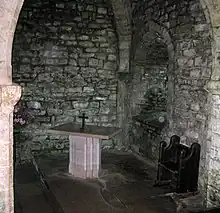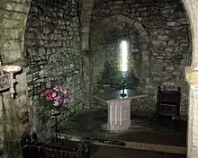 The interior of the chapel is approximately 7.7 metres (25 ft) square.[1] In the centre is a square pier supporting four square rib vaults, with the heavy ribs leading to transverse arches, all stop-chamfered.[4] In the north-west side is a Norman round-arched doorway. A small window is contemporary with the doorway. The corners of the chapel are orientated towards the cardinal points. The interior of the chapel contains a 12th-century groin vault, supported by a central column. Evidence uncovered during 20th century repairs to the chapel roof suggest that it may have been topped with a beacon at some time.[3] The roof now bears a stone cross erected in 1873.[5]