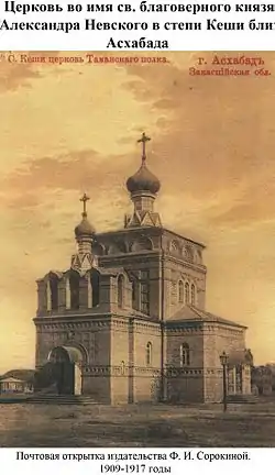 The Church of "Holy Blessed Grand Prince Alexander Nevsky" was established in 1882 and consecrated in 1900 as the parish church of the 1st Taman Regiment of the Kuban Cossack Host.[5] At the time, the church was located outside the city limit, in the village of Koshi, which was annexed by Ashgabat in 2013. It was designed to accommodate 350 worshipers and constructed of fired brick by order of General Aleksey Kuropatkin at a total cost of 14,740 rubles.