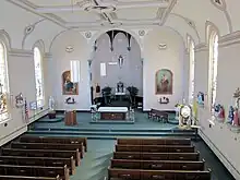 St. Aloysius Church is a Gothic Revival structure, five bays long and three bays wide, and officially one story high. Built of brick, laid in a stretcher bond, the walls rest on a foundation of stone rubble from Piqua, which includes a basement. A gabled roof of asphalt covers the rectangular church,[4] which measures 85 feet (26 m) long and 45 feet (14 m) wide.[2]: 230 One of the church's most prominent architectural elements is its tower: equipped with a white-painted wooden belfry and a tall spire,[4] the tower rests on its own walls, 2 feet (0.61 m) thick. The entire building cost approximately $7,500 to erect; much of this amount was donated by other nearby parishes.[2]: 230 Inside, the church's sanctuary includes elements such as white-painted altars and multiple sizes of pews: large pews for adults, and miniature pews for children. The interior is lit partially by many large stained glass windows; added more than 25 years after the church was completed, these windows were purchased by individual families within the parish.[4] Few elements of the church are original from the 1870s. The middle of 1905 saw the completion of a wide range of alterations,[2]: 230 including the removal of the original interior, the addition of a sacristy, the placement of the present stained glass windows, and the expansion of the sanctuary.[2]: 231