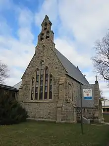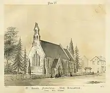 St. Anne's Chapel was built at the direction of John Medley soon after his arrival in Canada in 1845 as the first Bishop of the Anglican Diocese of Fredericton. Its architect, Frank Wills, was brought to Canada by Bishop Medley from Exeter, England in 1846 to work on Christ Church Cathedral.[1] Located at the corner of Westmorland and George Streets in the west end of the city, St. Anne's was intended as a chapel of ease in which services could be held until construction of the Cathedral was completed. The chapel's cornerstone was laid in May 1846 and it was consecrated on March 18, 1847. Bishop Medley himself paid most of the construction costs.[2] Christ Church Cathedral was completed in 1853 and in 1854 the chapel became Christ Church (Parish) Church, although it continued to be commonly known as St. Anne's. With the completion next to it of a much larger church building in 1962, St. Anne's became a chapel once more.[3][4] St. Anne's Chapel of Ease was declared a National Historic Site of Canada in 1989. The designation encompasses only the 1847 chapel, not the adjoining 1962 structure.[5]