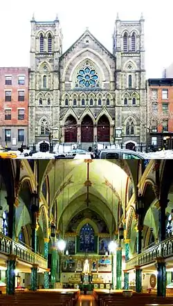 St. Bernard's Church was built from 1873 to 1875 to the designs of Patrick C. Keely and was the first church consecrated by an American Cardinal, Archbishop of New York John McCloskey.[3] Once considered one of the most important parishes in the city, the congregation at the time of erection consisted of mostly Irish immigrants and their descendants. Irish-born architect Patrick Charles Keely's design of "twin towers, triple-portal entrance, and rose window inset into a pointed arch reveal a masterful blending of French and English influences."[1] Also referenced as Ruskinian Gothic by the AIA Guide to NYC (2010)[2] The interior features a prominent U-shaped gallery and many figurative stained-glass windows in the style of Mayers of Munich. The church has at least one Tiffany window. Presumably since the 2003 merger, the interior has been significantly redecorated and painted with many of the transferable art objects of Our Lady of Guadalupe parish moved here. The reredos has been painted with many scenes of Our Lady of Guadalupe and the Blessed Juan Diego, and the modern Basilica of Our Lady of Guadalupe.