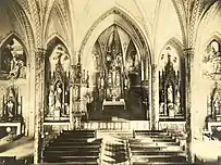 In 1892 the present rectory was built as a Franciscan monastery with 30 rooms plus a spacious attic. The previous rectory was located directly to the east of the church and needed to be moved to make way for an expansion of the church building. The parish then numbered about 100 families, fairly evenly divided between farmers, railroad people, and other business people. In 1894 the church was expanded, adding an apse and two transepts containing large stained-glass windows made by George A. Misch and Brothers of Chicago. The south window depicts the three patrons of the Franciscan order: St. Clare, St. Louis IX, King of France, and St. Elizabeth.[3] The north window shows the Holy Family of Jesus, Mary, and Joseph. The four stained-glass windows in the apse depict St. Francis receiving the stigmata, the Annunciation, the child Jesus appearing to St. Anthony, and St. Margaret Mary Alacoque receiving the devotion to the Sacred Heart. Much of the statuary dates back to the late 19th century and was manufactured in Munich, Germany.[4]: 55