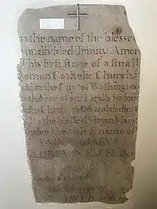 The church's southern entrance contains a relic of the first Catholic chapel built in Washington, D.C. This is an engraved dark sandstone which was the cornerstone of St. Mary's Chapel, a.k.a. "Barry's Chapel," built by James Barry (1755?–1808) and dedicated in 1806.[8] Barry's Chapel stood at F & 10th St SW under the present day Interstate 395 highway.