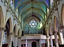 Besides the sanctuary windows, others also date to 1875, including a large rose window portraying St. Cecilia, as well as windows depicting St. Peter, St. Paul, and Dominican shields.[42] However, the majority of the church's stained glass windows were installed in 1965 and created by the Heimer[45] company.[1] The windows depict scenes from the life of St. Dominic and other Dominican saints.