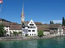 In or around 1007, Emperor Henry II moved St. George's Abbey from its former location on the Hohentwiel in Singen to Stein am Rhein — at that time, little more than a small fishing village on the Rhine. The move was a means to strengthen his presence at this strategic point, where major roads and river routes intersected. He gave the abbots extensive rights over Stein and its trade so that they could develop it commercially.[1] In this, they were very successful and Stein am Rhein rapidly became a flourishing and prosperous town which, in the 15th century, was itself (if briefly) granted reichsfrei status.