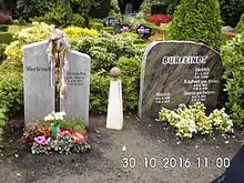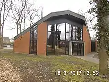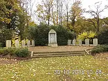 A new, still functioning, cemetery was opened further east on the Main Street at the corner of Am Friedhof.[59] The timber-framed mortuary was erected in 1839 on the new cemetery.[61] Clergy, sextons and municipal officials are buried close to the Main Street, where there also are two war memorials for the soldiers killed in action in the Franco-German war and in the two World Wars. The section stretching northerly is divided by a central avenue, east of it residents of Himmelpforten are buried, west thereof gravesites serve the people from the other parish villages.[59] At the northern end of the cemetery there is a section of forest, where in 1976 the architect Uwe Oellerich from Himmelpforten built the cemetery chapel on behalf of the municipality of Himmelpforten.[59] The chapel was renovated in 2013.[62]