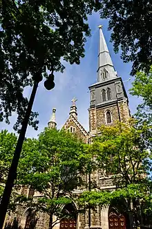 The parish now known as Blessed Michael McGivney Parish was the first Catholic parish erected in New Haven, and is the second oldest Roman Catholic parish in Connecticut. The parish was originally established in 1832 as Christ Church Parish, becoming Saint Mary Parish in 1848. The current Saint Mary church building, located on Hillhouse Avenue near Yale University, was dedicated in 1874. In 1882, Michael J. McGivney, the Saint Mary's assistant pastor, founded the Knights of Columbus at the parish.[1] McGivney, whose remains are interred within the church, was beatified by Pope Francis in 2020.