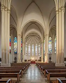 A competition was therefore held to design a new church, with entries from August Menken among others. It was won by Engelbert Seibertz, with its foundation stone laid on 23 October 1893 by the parish priest and the consecration on 24 October 1895 led by Georg von Kopp, cardinal and bishop of Breslau. That new church was a hall church and still stands today on Winterfeldtplatz in the Schöneberg district.