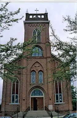 Catholic missionaries from Paulding County arrived in 1853, and the community build its first church on the site in 1866, with 12 families on the roll.[2] Its first resident parish priest, Fr. Louis Vally, arrived in 1868. Under his leadership the parish grew considerably, starting its parochial school in 1873 and acquiring land for its convent in 1877. It was also during Vally's tenure that the current Gothic Revival was built, in 1886.[1]