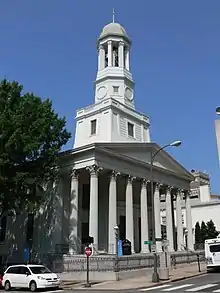 St. Paul's was built in 1845 as a branch of the Monumental Church, which had outgrown its building. The Greek Revival church was designed by Thomas Somerville Stewart and modeled largely on St. Luke's Church, now Church of St. Luke & the Epiphany, in Philadelphia.[5] The cornerstone was laid on October 10, 1843 and the church was consecrated on November 11, 1845.[6] The estimated cost before construction was "not exceeding $53,500," excluding the organ and purchased lots. This cost later rose to $55,000. The organ was purchased for around $4,000 and the two lots for the church were $6,000 and $1,075. In 1845, there were 804 sittings in the nave and 358 in the gallery for a total occupancy of 1,162 parishioners.