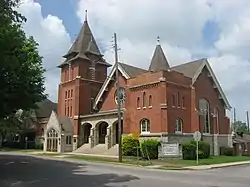 St. Peter's First Community Church, also known as the German Reformed Church and St. Peter's United Church of Christ, is a historic church located at Huntington, Huntington County, Indiana. It was built in 1903, and is a red brick and limestone church building with an eclectic plan and Late Victorian design elements. It features a two-tiered central tower with angled buttresses, tall and narrow openings, and topped by a steep pyramidal bell-cast roof. Its stained glass windows include German language texts and an image of Christ's ascension.[2] The building was designed by Will A. Stevens, a Huntington native who graduated from Cornell University in 1890.[3]: 5–6