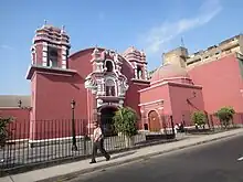 St. Sebastian's Church (Spanish: Iglesia de San Sebastián) is a Catholic church in the historic centre of Lima in the corners of Ica and Chancay streets, one block from Tacna Avenue, in the old neighbourhood of Monserrate (then Cuartel Primero). Its pink and white front faces Jirón Ica. In antiquity, it is the third parish in Lima founded in 1554; It was preceded by the Tabernacle, in 1535, and Santa Ana, in 1550.