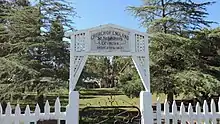 The church is positioned centrally within the site, which slopes gently to the east. The nave is orientated east-west, with the chancel at the eastern end and Dove Street to the west. Entrance to the site is through a timber arched gateway with a small pine tree and a short bay of picket fencing to either side. The remainder of the fencing is of timber rails. There are several saplings to the perimeter fence, and a clump of eucalypts to the northern side. To the east of the site is a small weatherboard store, and a memorial to the gold miner Dan Bray under an open shelter also roofed in shingles.[1]