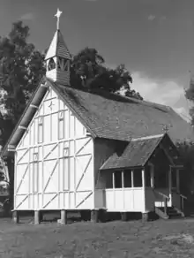 The church is a simple rectilinear form, with the chancel to eastern end and the porch to the south of the western end. The addition housing the vestry is to the south-east corner. The wall framing of studs, noggings and bracing is exposed to the exterior of the building, and purposefully arranged as a decorative element which is further emphasised by its contrasting colour. The wall cladding to the interior of the framing is pit-sawn planks of cypress pine, some 250 millimetres (9.8 in) wide, laid horizontally. The roof is steeply pitched with gable ends, and a timber bell-cote with spire at the western end. The roof is clad in hand-split hardwood shingles. The entry door from the south porch is a boarded and ledged door with a lancet head, and still furnishing its original bolt and rimlock. Inside, the nave has a special quality of light created by a continuous opening between the top of the walls and the roof framing, to the sides and the gable ends. The tall, narrow windows hand painted with a stipple pattern also contribute to this light. These windows have trefoil heads applied to the outside, giving them a Gothic-like shadow internally. They open by sliding along tracks to the inside of the wall. The floor is of wide raw cypress pine boards, which are hand-scrubbed clean to retain their bleached appearance. The exposed roof framing and trusses have been stained. All the major members are stop chamfered. The trusses feature twisted vertical tie rods. The chancel arch, also of lancet form, is lined with beaded board.[1]