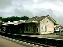 The main building is on the south side of the line, nearest the town centre and facing the bus station. It was built in 2001 to a design by Lacie Hickie Caley[16] and contains a booking office and shop. The wooden building on this platform dates from Great Western Railway days. The station car park is situated behind this platform. An accessible footbridge links the two platforms.