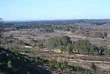 St Catherine's Hill, together with Ramsdown and Blackwater hills, comprise a 3-mile (4.8 km) long ridge running roughly north to south between the Avon and Stour valleys just to the north-west of where the rivers converge in the borough of Christchurch in Dorset.[11][30][31] The top of this ridge is almost a level plateau, 45 metres (148 ft) above sea-level at the southern end and 49 metres (161 ft) in the north. St Catherine's hill, in the south, forms the highest point of this three hill chain at 53 metres (174 ft) and has some of the steepest slopes at 1:1 or 45°.[30][31] The 400 acres (160 ha) site is a mixture of woodland and heath and is part of a larger Site of Special Scientific Interest (SSSI). The eastern slopes and foot of the hill, an area referred to as the Town Common, is almost exclusively open heath and as such has also been designated a Special Protection Area (SPA) and Special Area of Conservation (SAC).[18][31]