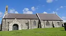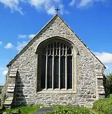 The present building dates from the 12th century; it is the only medieval building in the parish.[10][11] During the 13th century, the chancel was extended, and the older part of the church may have been rebuilt using the previous stones at this time.[5][10] By 1535, the position of rector of the parish was held by the person holding the position of Archdeacon of Anglesey, as part of the remuneration for that office; this is no longer the case.[12] Further structural changes to the church were made in the early 16th century when some windows were added to the chancel. In 1852, restoration work took place to the nave and chancel under Henry Kennedy, architect of the Diocese of Bangor.[10] The chancel was rebuilt, although the east wall and window were retained, and further windows were added in the church.[5]