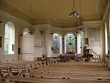 The oldest part of the church is the tower, which dates from the 14th century, but was rebuilt in the 15th century, with larger stones. It is built of limestone, in two stages, and has small diagonal buttresses. The door and windows have pointed arches, and there is a vestry on the north side. By the late-18th century, the church was ruinous, and the nave was demolished and rebuilt in brick in 1779. It has round arched windows, and an apse, and is described by Nikolaus Pevsner as "handsome, rectangular [and] well-lit".[1][2][3]