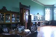 The library holds several collections of books donated by past rectors and fellows of the college, contained in custom-made locked shelving units as a private library of books of historical relevance to the college. The stained glass windows on the eastern and western walls of the library are by Hardman & Co., Birmingham. The eastern windows contain the coats of arms of Bishop Davis, Archbishop Polding, St John's College, and Archbishop Vaughan. The western windows contain the coat of arms of William Bernard Ullathorne, Cardinal Moran and Archbishop Kelly.
