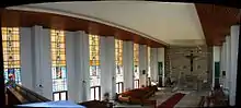 Fixed to the wall above the altar is a large, stained and varnished timber crucifix flanked by timber Greek letters alpha and omega.[1]