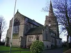 Internally, the sandstone masonry is exposed and there is an open timber roof. The arcades are carried on octagonal piers. In the chancel is a double sedilia and a piscina. The stained glass in the east and west windows dates from the late 19th century.[2] In the northwest aisle is a window depicting Saint Margaret made by E. H. Jewitt of Shrigley and Hunt in 1911, and in the south aisle is a window by A. L. Moore depicting Boaz, Ruth and Naomi.[7][3] The two-manual organ was built in 1903, but its builder is uncertain. It was cleaned and restored in 1998 by David Wells of Liverpool.[8] There is a ring of six bells, all cast by John Taylor & Co at various dates between 1934 and 1983.[9]