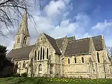 Saint John the Evangelist is the Church of England parish church of Penge (now in the London Borough of Bromley), in the Diocese of Rochester, Greater London. At the time of its erection, Penge was in Surrey and had been an exclave of Battersea. It is located on Penge High Street, and was erected 1847 to designs of architects Edwin Nash & J. N. Round. Later in 1861, Nash alone added the gabled aisles, and in 1866 the transepts. The Pevsner Buildings of England series guides describe it as "Rock-faced ragstone. West tower and stone broach spire. Geometrical tracery, treated in Nash's quirky way. The best thing inside is the open timber roofs, those in the transepts especially evocative, eight beams from all four directions meeting in mid air.[2] It has been Grade II listed since 1990.[3]