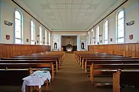 Internally, the church is simpler and less decorated than its exterior, but this is typical of other neoclassical basilicas built in Canterbury during the same period. The interior includes a large organ and choir loft cantilevered above the nave.[3]