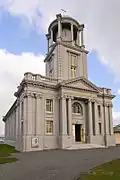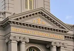 The 1866 church was demolished in February 1914. Bishop John Grimes laid the foundation stone on 23 March 1914. The new church occupied the site of the previous church, but with the entrance facing Sewell instead of Tancred Street. The nave of the church was first used on Christmas Eve in 1914. Owing to the outbreak of World War I and funding difficulties, it was not until 1920–21 that the portico and tower were added.[1] The portico is adorned with the Latin phrase Deiparae Virgini Mariae ("Mother Virgin Mary") and the abbreviation D.O.M., which refers to the Latin phrase Deo optimo maximo ("to the greatest and best God").[2]