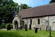 In the 19th century, the north wall was rebuilt, the west gable was restored, and a vestry was added. In the west wall is a doorway with no ornament other than plain imposts, described by Nikolaus Pevsner as "very unusual". Atop the roof is a bell turret. Inside, there is no division between the nave and chancel. On the south side of the chancel, one window has stained glass, designed in 1879 by C. E. Kempe. The chancel ceiling dates from about 1890, and was designed by Temple Moore.[1][2]