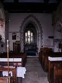 The church consists of nave, chancel and a south aisle separated from the nave by a three-bay arcade. The chancel arch is in the form of two arches, one inside the other, designed to accommodate the 5-foot (1.5 m) thick east wall, which supports the belfry.[8] The pointed arches of the south arcade are supported by round piers with varying capitals. In the angle of the chancel and south aisle there is an early thirteenth-century chapel.[8] Two round-headed Norman windows remain; the west window of the south aisle and the centre window in the north window of the chancel.[5][8] The chancel east window has the only stained glass in the church.[5] The "fantastically long"[4] hagioscope, about 9 feet (2.7 m) in length and resembling a tunnel, runs from the south aisle into the chancel through one of the pillars of the arcade and the chancel arch. These architectural features allowed worshippers in the aisle to see the bread and wine being consecrated during the Celebration of the Eucharist.[6] The church is roofed with Horsham slabs, a common material in churches in the area.[5] The oak shingled spire of 1602 rests partly on the masonry of the old belfry, or bell turret, and partly on the east wall of the nave.[5][8]
