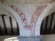 In the splay of the north nave window is a 14th-century depiction of Christ standing on a wheel and surrounded by the tools of different trades. He has his arms raised, apparently to better display his wounds. The tools include tailor's shears, a butcher's cleaver, a carpenter's square and a weaver's shuttle. Above Christ's right shoulder there are two dice.[5] Similar paintings are found in many other medieval English parish churches. The subject has been much discussed in the past but has been conclusively identified as a warning against breaking the Sabbath.[15] The message is that by working on Sunday one inflicts new wounds on Christ.[5][15]