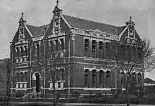 During the early 1890s plans for a completely new church were well underway, and, hampered only by a lack of funding, work progressed slowly. The new church opened in February 1900 while the old church became both a parish church hall and classroom. By 1907 the school was offering classes for girls up to the Merit Certificate (Grade 8) level. The old building was soon after condemned by the local board of health which necessitated the need to draw up plans to build a new girls school. Demolition of the old church was completed in 1913 and the foundation stone for the new school was laid early the following year. The new school was to cater for 500 students and so a two-story building of red brick, comprising nine classrooms, was constructed on Victoria Street.[4] On 5 July 1914 the building, designed by Kempson and Conolly, was formally opened by Archbishop Mannix.[5]