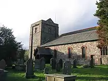 In the churchyard to the south of the church are three more Grade II listed buildings. The sundial is possibly the stump of a medieval churchyard cross.[6] The Atkinson monument consists of a headstone dated 1805.[7] Also to the south of the church is a group of four tombs dating from the late 18th and early 19th centuries.[8] There is a ring of 12 bells in the tower. Originally a ring of 8, they were augmented to 10 and later to 12.