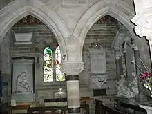 There are numerous memorials including, in the Vernon Chapel, a large monument to Thomas Vernon (died 1721) by Stanton and Horsnaile. It has a semi-reclining effigy flanked by the figures of Justice and Learning and behind this, Corinthian columns supporting an open pediment. There is also a standing monument of Bowater Vernon (died 1835) by Roubiliac, a large marble relief panel by Chantrey to Thomas Taylor Vernon (died 1837) and a late 17th-century memorial to Richard Vernon (died 1678).[2]