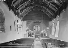 Inside the church is the original Norman west doorway of the nave; this was formerly on the exterior of the church, but now leads into the tower. Above this is a 12th-century window.[2] The roof of the nave has been dated by dendrochronology to 1494–95. In the south wall of the nave is a trefoil-headed piscina, in a position corresponding to the external tomb recess. The font dates from the 12th century. There is stained glass in the east window and in some of the nave windows by Hardman, and in one window in the south wall of the nave is a window dated 1920 by Kempe and Company.[3] There are separate war memorial plaques to the parish dead of the two World Wars, a slate plaque to Lieutenant Edward Whitehead (killed in First Gulf War 1991), and a prayer desk given in memory of Robert Henry Cooper and his comrades who were killed in World War II in the sinking by enemy action of MV Siamese Prince.[4] In 2021 a five year long project financed by a legacy and grants led to the conversion of a disused vestry to provide the church with a toilet, kitchenette and an internal spiral staircase to give access to the belfry for ringers.[5]