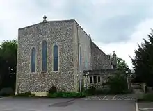 Residential development in the High Salvington area, north of Durrington and within its parish, encouraged the vicar of St Symphorian's Church to open a mission chapel there at his own expense.[23][25] At first, services were held every two weeks (Evensong), augmented by a monthly Eucharistic service. Later this changed to weekly Matins and fortnightly Holy Communion.[1][25] On 20 April 1951, after the vicar died, the church was sold to the parish for £600 (£20,000 in 2024).[18][1][23][26] The church still had no dedication and was known simply as the Mission Church. On 3 July 1951, the Archdeacon of Chichester conducted a ceremony at which it was dedicated to Saint Peter.[26]