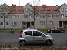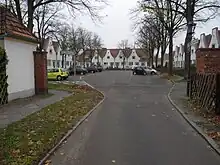 The Staaken Garden City is a housing estate located in the Berlin district of Spandau next to the old village of Staaken. It was built between 1914 and 1917 according to the design of the architect Paul Schmitthenner. It is considered one of the most significant urban development achievements of the early 20th century because of the layout of the streets and squares, the intelligent handling of house types and variations, and especially because of its model effect on the Berlin housing estates of the 1920s. The Staaken Garden City was planned with 1000 apartments and a number of public buildings for 5000 inhabitants. Unlike most other projects of this type, size and construction period, it was completed almost entirely within four years according to the original design.