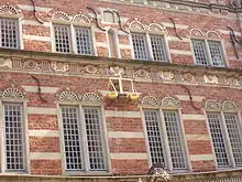 A historical document from 1330 mentions a weigh house where all the merchants and tradesmen had to weigh their goods. From 1440 or even earlier, the building was situated in Langenstraße, one of the main Bremen thoroughfares. Between 1586 and 1588, a new building was erected on the same site by Lüder von Bentheim.[1] Built of brick in the Weser Renaissance style, it was decorated with sandstone ornaments. Pilasters sprang up from each of the gable ledges while the windows were surmounted with shell-shaped ornaments. Above the second-storey window, there was a putto frieze depicting figures. A sign with a golden balance symbolised the building's role. From the street, the building was accessed through two round arches. The upper storeys consisted of storage rooms for the city council's grain reserves. The weigh house was in use well into the 18th century. From 1877, the tax and excise offices were housed in the building, together with the land-registry office until 1925. From 1927 until its destruction, the building was the headquarters of the first Bremen broadcasting station NORAG (Norddeutsche Rundfunk AG).[2]