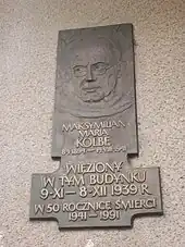 The camp was established in September 1939, shortly after the invasion of Poland which started World War II, as a Dulag transit camp for Poles. It was located in over 30 buildings and places throughout the town.[2] Some 22,000 Polish POWs and 12,000 Polish civilians passed through the camp.[2][3][4] Also Franciscans from Niepokalanów were held there, including Maximilian Kolbe,[4][5] who was later killed in the Auschwitz concentration camp and is now considered a saint of the Catholic Church.[6] Conditions in the overcrowded camp were poor, food was scarce, sanitary conditions were bad and medical aid was practically nonexistent.[3][7] There were cases of abuse of wounded or sick POWs by German doctors, and one even recommended "treating dysentery patients with starvation."[7] To aid the prisoners, the Poles of Ostrzeszów smuggled food, clothing, shoes, blankets and books for the camp's inmates, as well as assisted in escapes from the camp.[8] In retaliation, the Germans carried out the first expulsions of Poles from Ostrzeszów already in September and December 1939, and murdered a number of Polish hostages from the town during the large massacres of Poles in Winiary.[9]