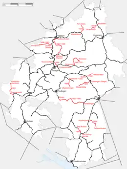The original intention of the government of the Kingdom of Württemberg was to leave the construction of branch lines to private companies. However, when only a few companies took up the offer, a law to enable the construction of the first state branch line was passed in 1887. The line in question, the Schiltach-Schramberg railway, ran from Nagold to Altensteig and was followed soon afterwards by the Swabian Alb Railway from Reutlingen to Honau and the Kocher Valley Railway from Waldenburg to Künzelsau. However, the state had limited funds and relied on financial contributions from local authorities along the route; the villages, however, had limited spending power and budgetary restrictions were extended to railway stations.