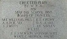 The community was laid out by Alec Street in the mid-1880s and was named for nearby Star Mountain. Street ran a store and a gin in the community. A post office was established in 1886 with Calvin Skinner as its first postmaster.[3] In 1890, the first public road opened from Star to Goldthwaite. By 1895, the community had a saloon, several grocery stores, and a drug store. A tornado struck Star on May 5, 1904. Two people were killed and five homes were completely destroyed.[5] The community recovered and a permanent church was built in 1905. In 1910, a bank opened.[2] A four-room, two-story stone school building was completed in 1913. A hailstorm damaged homes, businesses, and the school on April 22, 1924. Star's bank was robbed in 1928 and the robber got away with about $3,000 and several valuables. Four years later, during the Great Depression, the bank was sold to the Trent State Bank in Goldthwaite.[5] By 1939, Star had eight businesses operating in the community. That same year, three area schools – McGirk, Center City, and Hurst Ranch – consolidated with Star. In 1940, the W.P.A. erected a new school designed by Wyatt C. Hedrick for the Star Independent School District; it is the only school built in Mills County by the W.P.A.[6] The population stood at around 170 in the mid-1940s. The rising usage of the automobile caused a decline in the number of local businesses. By 1980, the community had an estimated population of 85. That figure remained steady through 2000.[2] It went up to 110 in 2010.[3]