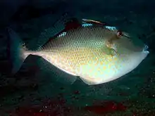 The starry triggerfish (Abalistes stellaris), or flat-tailed triggerfish, is a tropical, harmless, oviparous bottom dweller, characterized by some white spots along the spinal dark band. The tail is dorsoventral and looks very thin, when looked upon in profile. There is a deep groove in front of the eye. The background colour is grey with olive green spots. Its mitochondrial DNA has been sequenced by the University of Tokyo, Japan.[1] Male adults grow up to 60 cm.