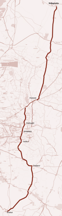 State Highway 35, commonly referred to as Sidlaghatta-Anekal Highway, is a state highway running from Sidlaghatta (North) to Anekal (South) passing through Hoskote, Kadugodi, Whitefield,[3] Varthur, Gunjur, Sarjapur, Attibele.[1] Part of it is maintained by the Karnataka Public Works Department and a part by Bruhat Bengaluru Mahanagara Palike. Majority of the highway is 2-laned, except for the section between Kadugodi and Varthur-Kodi which is 4 laned.