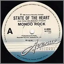 "State of the Heart" is a song written by Eric McCusker.[1] In Australia, it is best known for being recorded by Australian rock group Mondo Rock (of whom McCusker was a member); the track was released in October 1980 as the lead single from the band's second studio album, Chemistry (1981), and peaked at number 6 on the Australian Kent Music Report.[2]