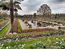 A statue of Diana, Princess of Wales is located in the Sunken Garden of London's Kensington Palace. Commissioned by Diana's two sons William and Harry on the 20th anniversary of her death, the statue was designed and executed by sculptor Ian Rank-Broadley and placed in the newly redesigned garden by Pip Morrison before being unveiled as a memorial to Diana on 1 July 2021, which would have been on her 60th birthday.[1]