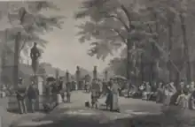 Frederick VI died on 3 December 1839. The initial preparations of a monument to his honour had already started prior to his death. C.F. Wilckens and Just Mathias Thiele states that Bertel Thorvaldsen began to work on a monument to Frederick VI at his own initiative. It depicted the king on his throne wearing his coronation gown and was intended for a location in Rosenborg Castle Gardens. Thiele wrote to Thorvaldsen just two days after the king's death proposing an equestrian statue at Esplanaden but Thorvaldsen ignored this proposal and continued work on his Rosenborg proposal.[2] Christian VIII did however not like Thorvaldsen's proposal and a committee headed by Jonas Collin was instead set up. A memorial concert in the Church of Our Lady was held on the one year's anniversary of the king's death to raise money for the monument but then nothing happened for several years.[3]